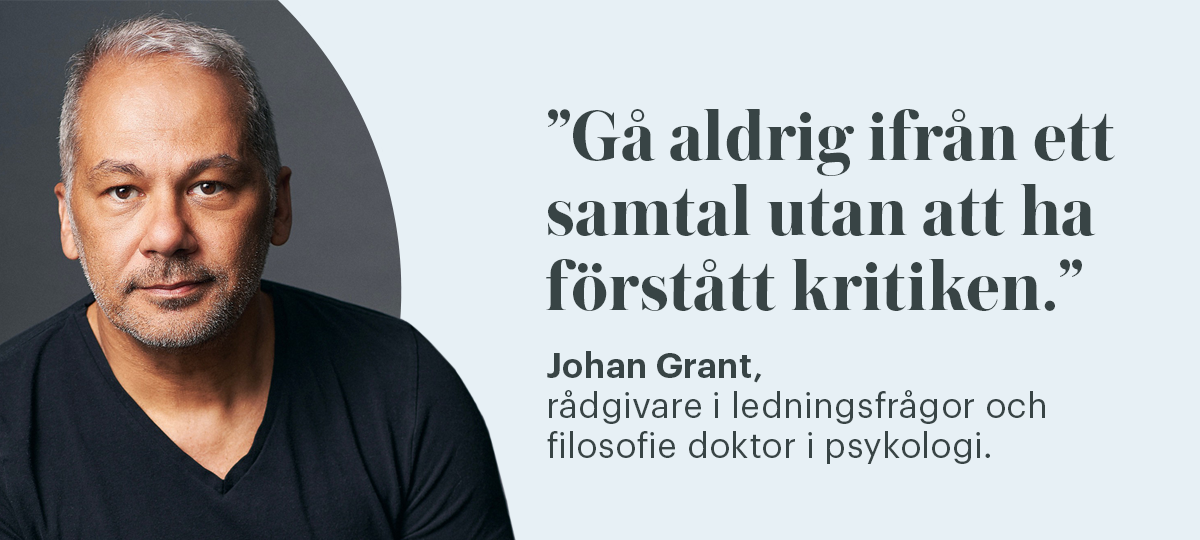 – Gå aldrig ifrån ett samtal utan att ha förstått kritiken. Men gör även ditt eget omdöme om den. Ta ansvar, säkra att du förstår och agera utifrån det. Det är att vara en proffsig chef, säger Johan Grant.