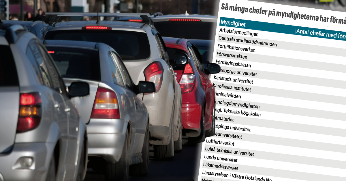 På Trafikverket har ledningsgruppen samt regionala direktörer och måldirektörer rätt till förmånsbil. Myndighetens generaldirektör Robert Maiorana kör exempelvis en Volvo XC60 T6 Core Edition, medan några andra chefer kör elbilar från Audi.